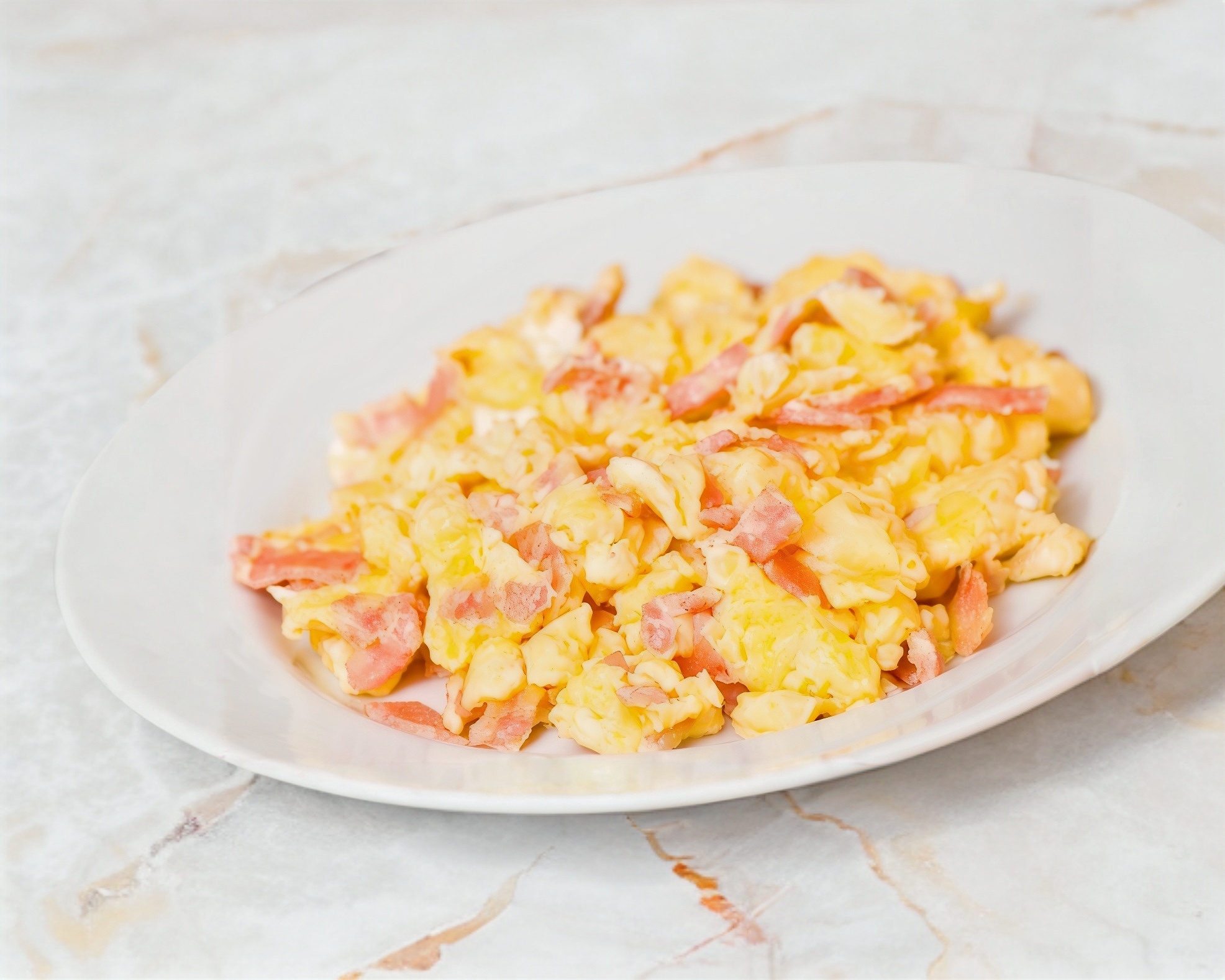 Jamón con huevo revuelto, acompañado de frijoles, tortillas y aguacate.