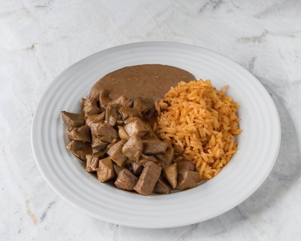 Carne de res(80 gramos ) en trozos guisados con chile, tomate y cebolla, acompañada de arroz(150 gramos ) y frijoles. salsas
