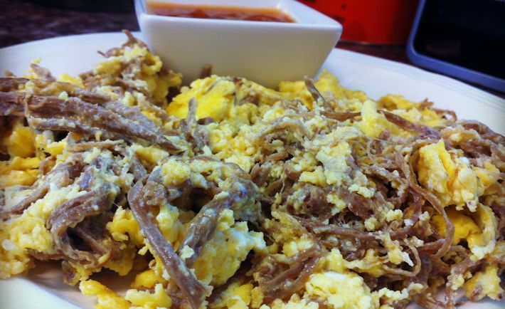 Machacado con huevo a la maxicana o natural. Acompañado de frijoles, aguacate y tortillas.