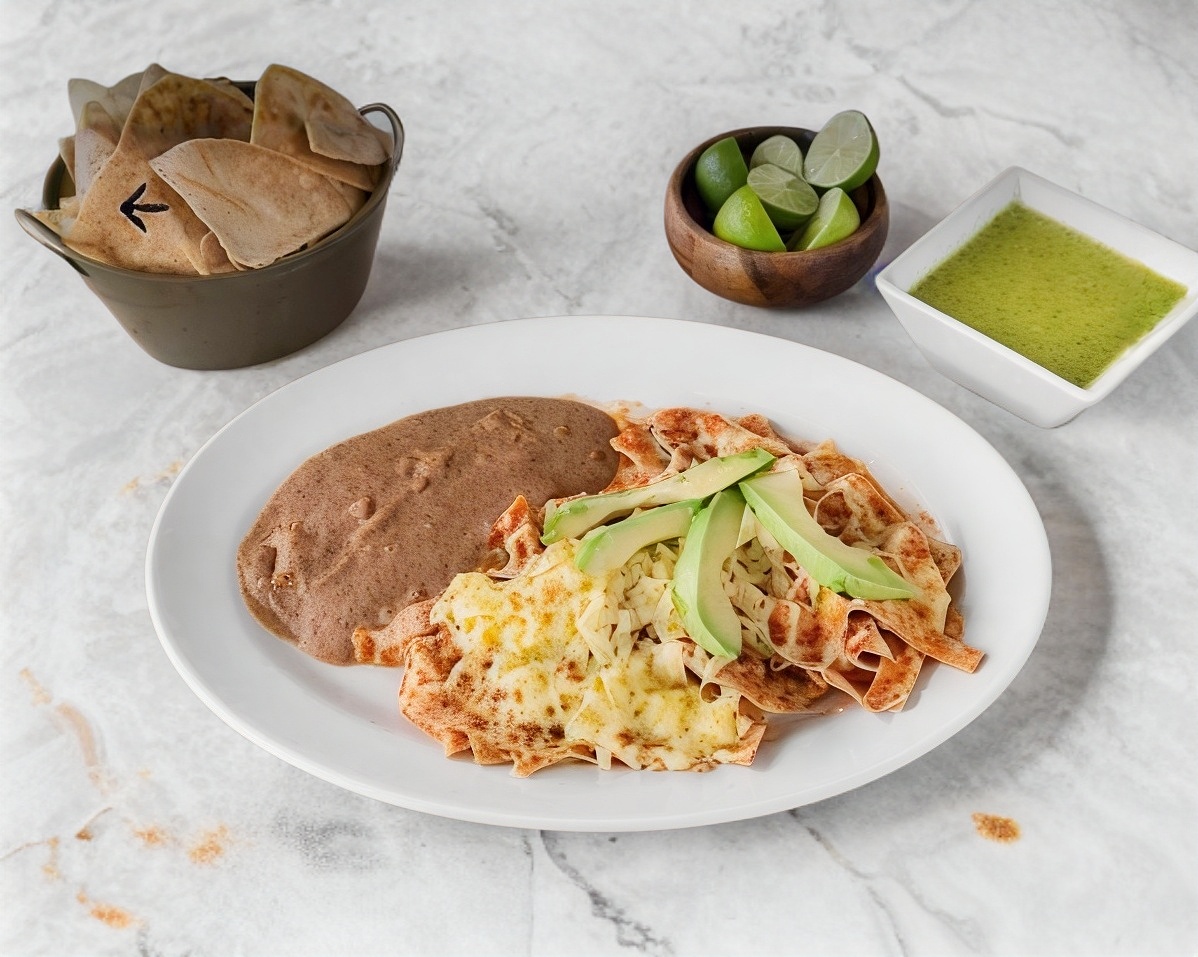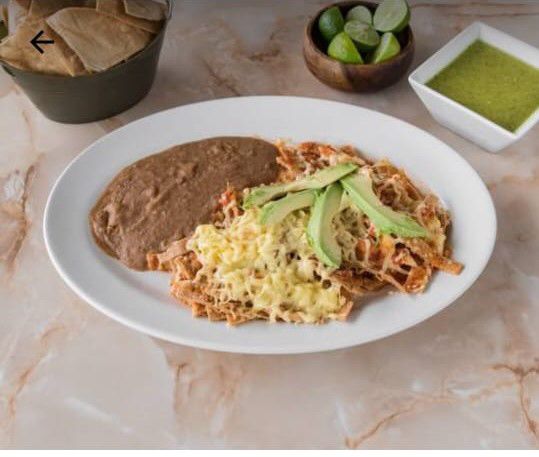 Chilaquiles con Pollo, acompañada de arroz, frijoles y ensalada de lechuga, tomate y aguacate.