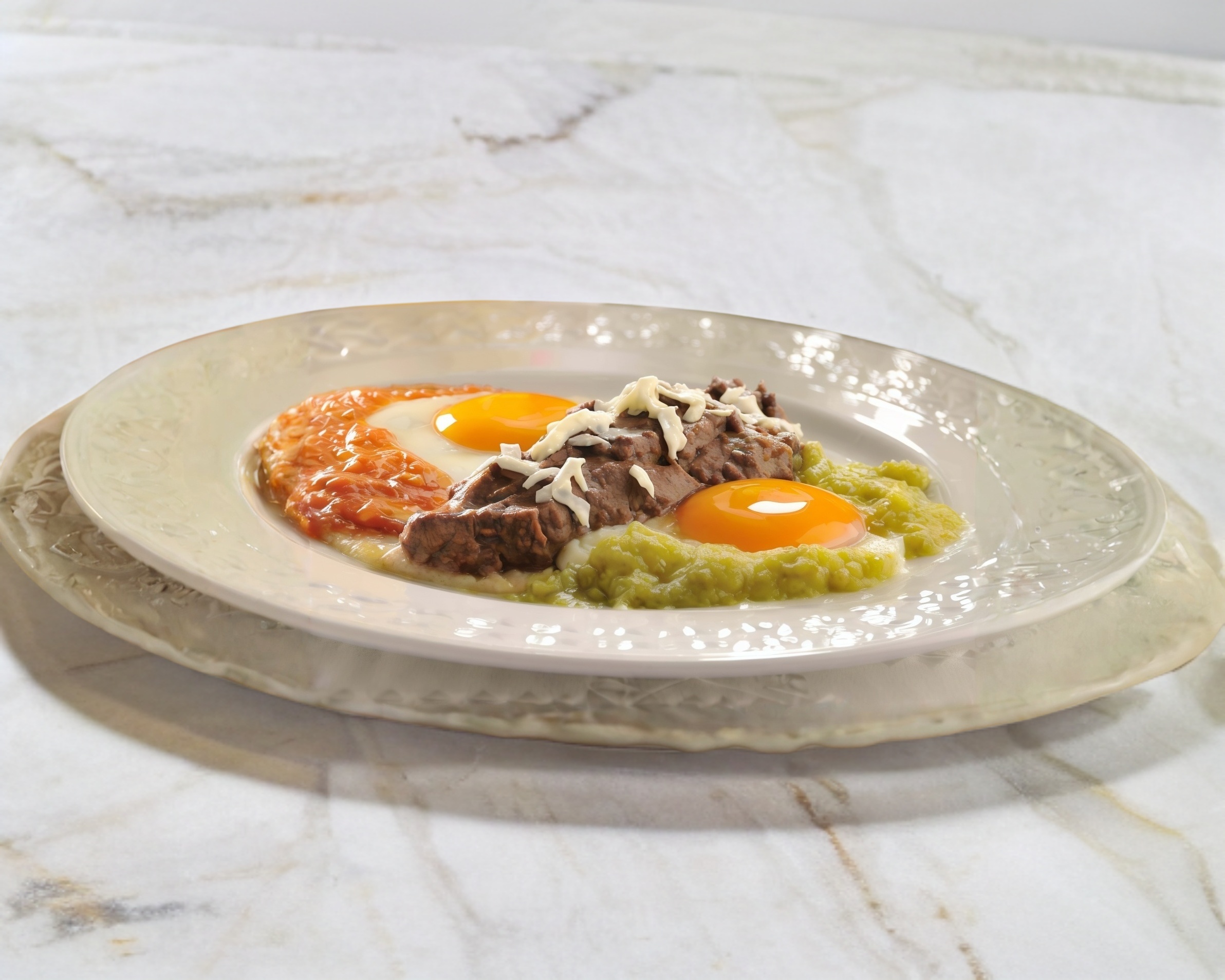 Huevos estrellados montados, con salsa roja y verde encima, se acompaña por frijoles, aguacate y tortillas.