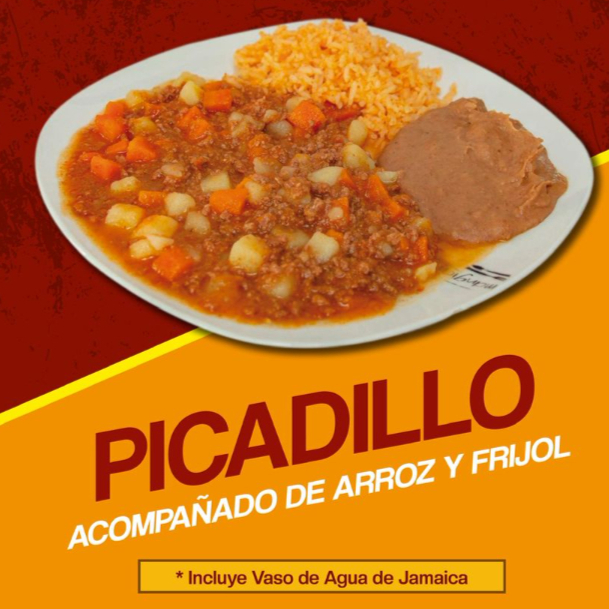 Picadillo acompañado de arroz y frijol, incluye agua de jamaica (355ml)