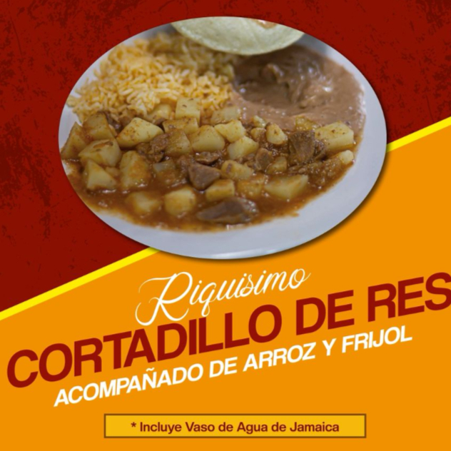 Cortadillo de Res acompañado de arroz y frijol, incluye agua de jamaica (355ml)