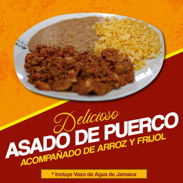 Asado de puerco acompañado de arros y frijol, incluye agua de jamaica (355ml)