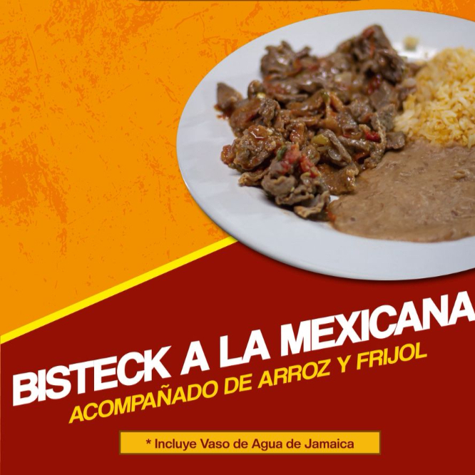 Bisteck a la Mexicana acompañado de arroz y frijol, incluye agua de jamaica (355ml)
