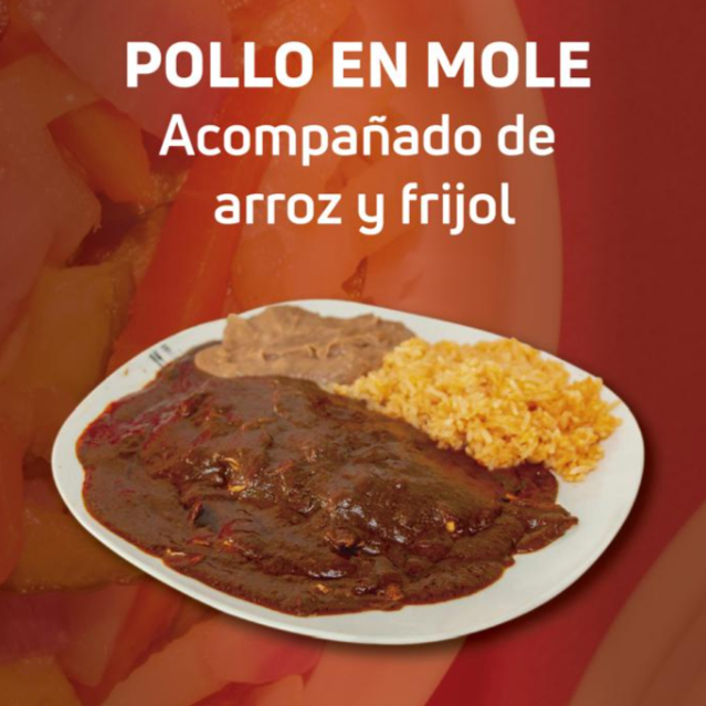 Pollo en Mole acompañado de arroz y frijol, incluye agua de jamaica (355ml)