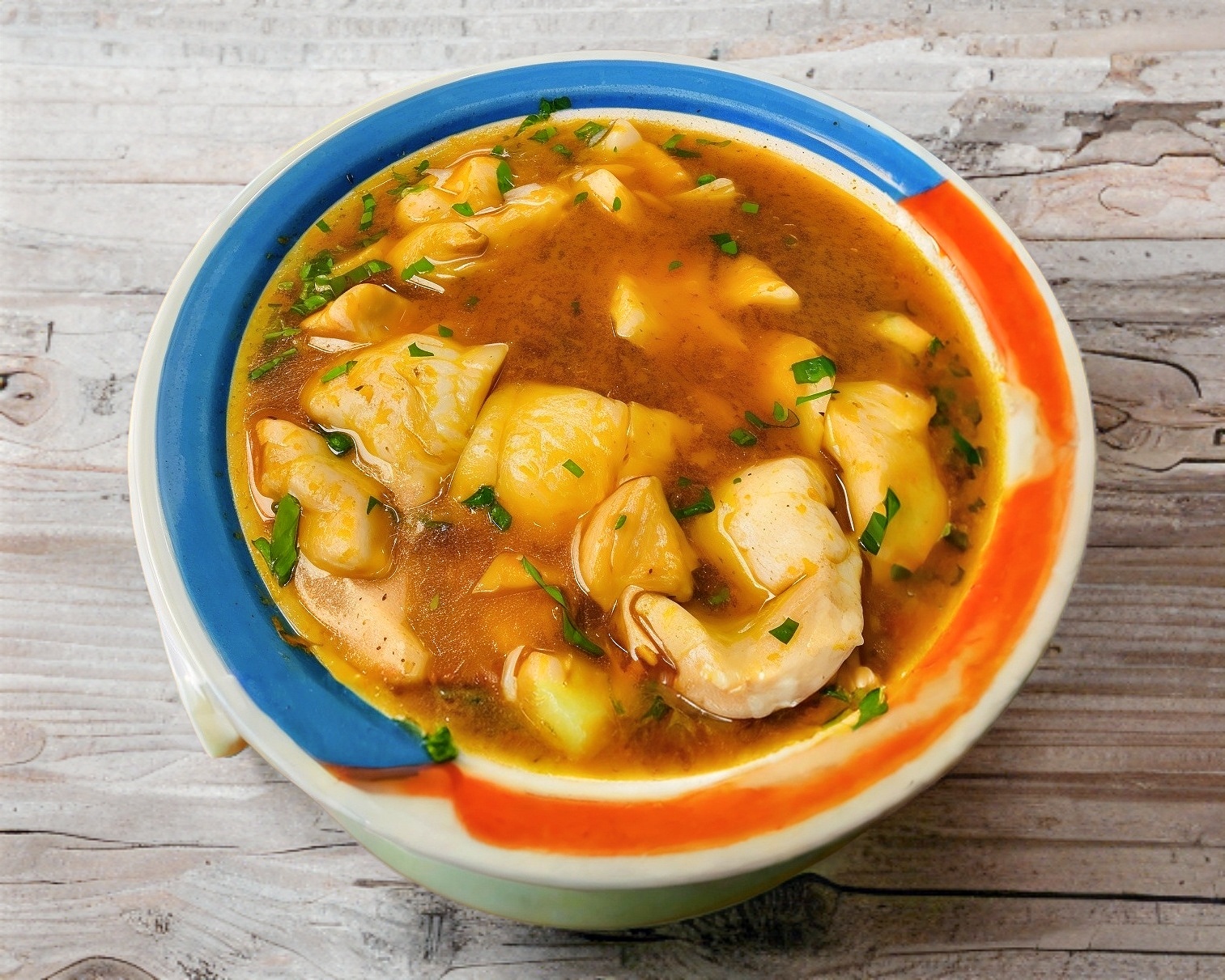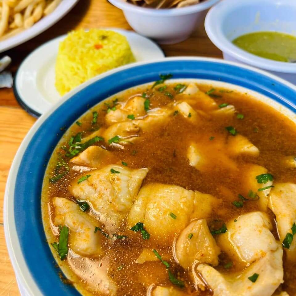Medio litro de consomé con trozos de pescado, camarón, almeja y combinado de mariscos.
