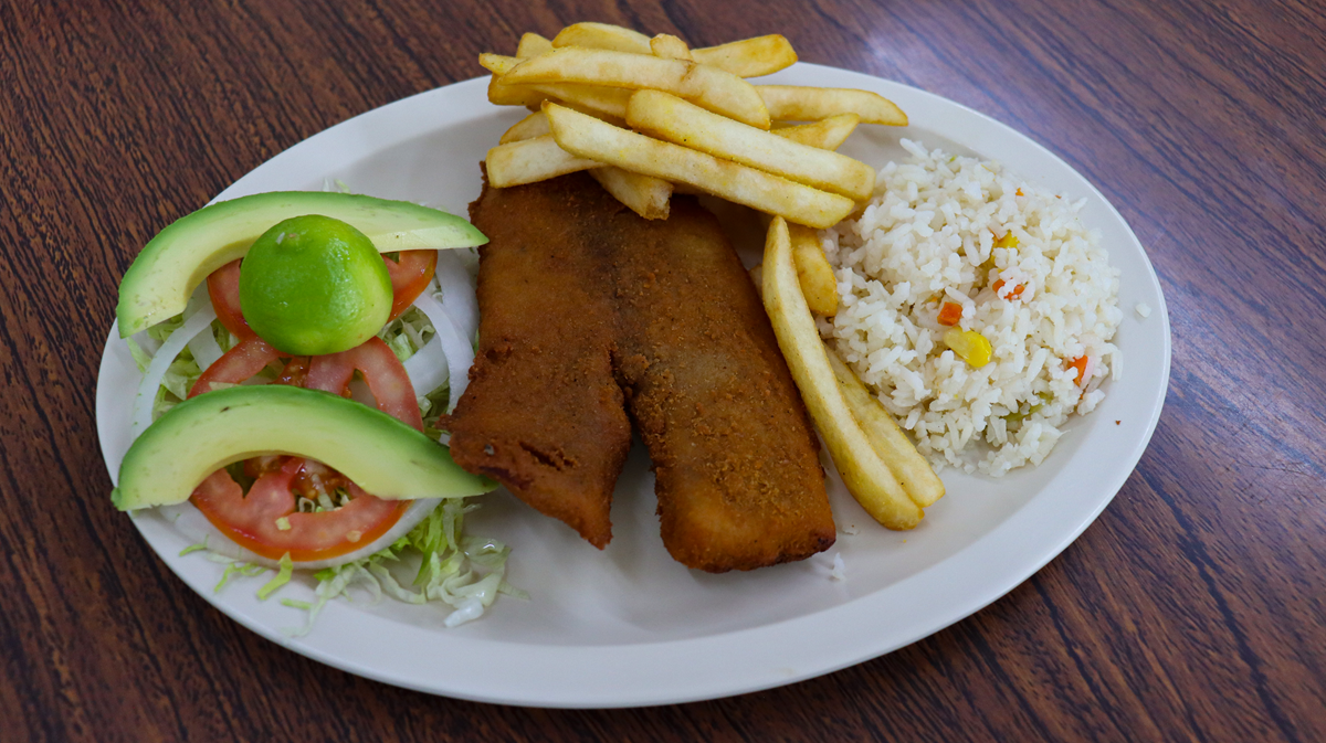 Mojarra frita (500 a 650 g) acompañada de papas a la francesa, arroz y ensalada.