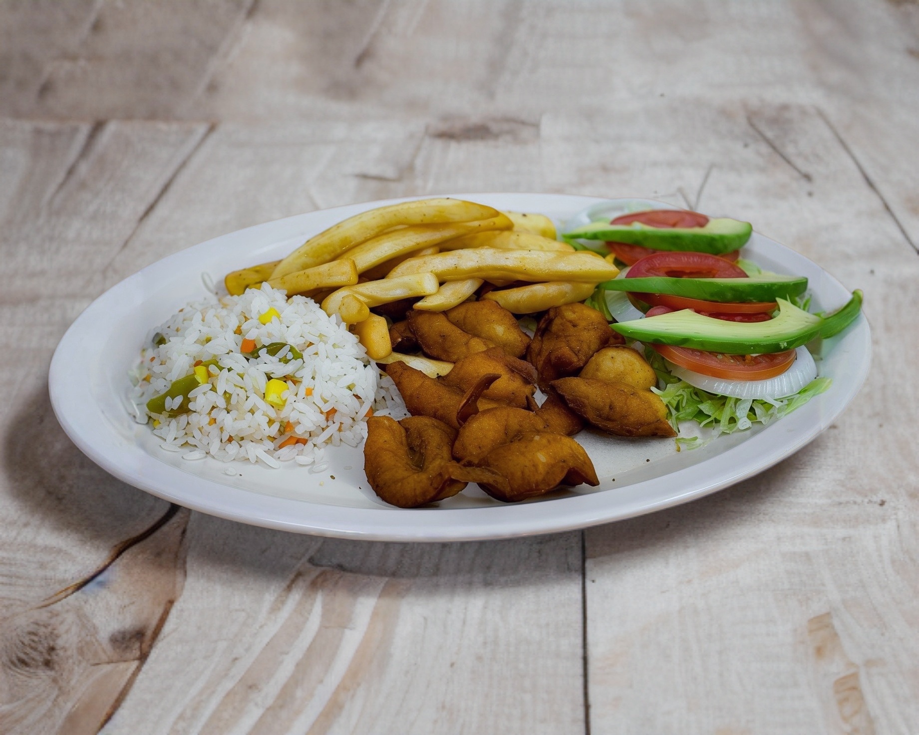 10 Camarones empanizados con coco rallado acompañados de arroz, ensalada y papas a la francesa.