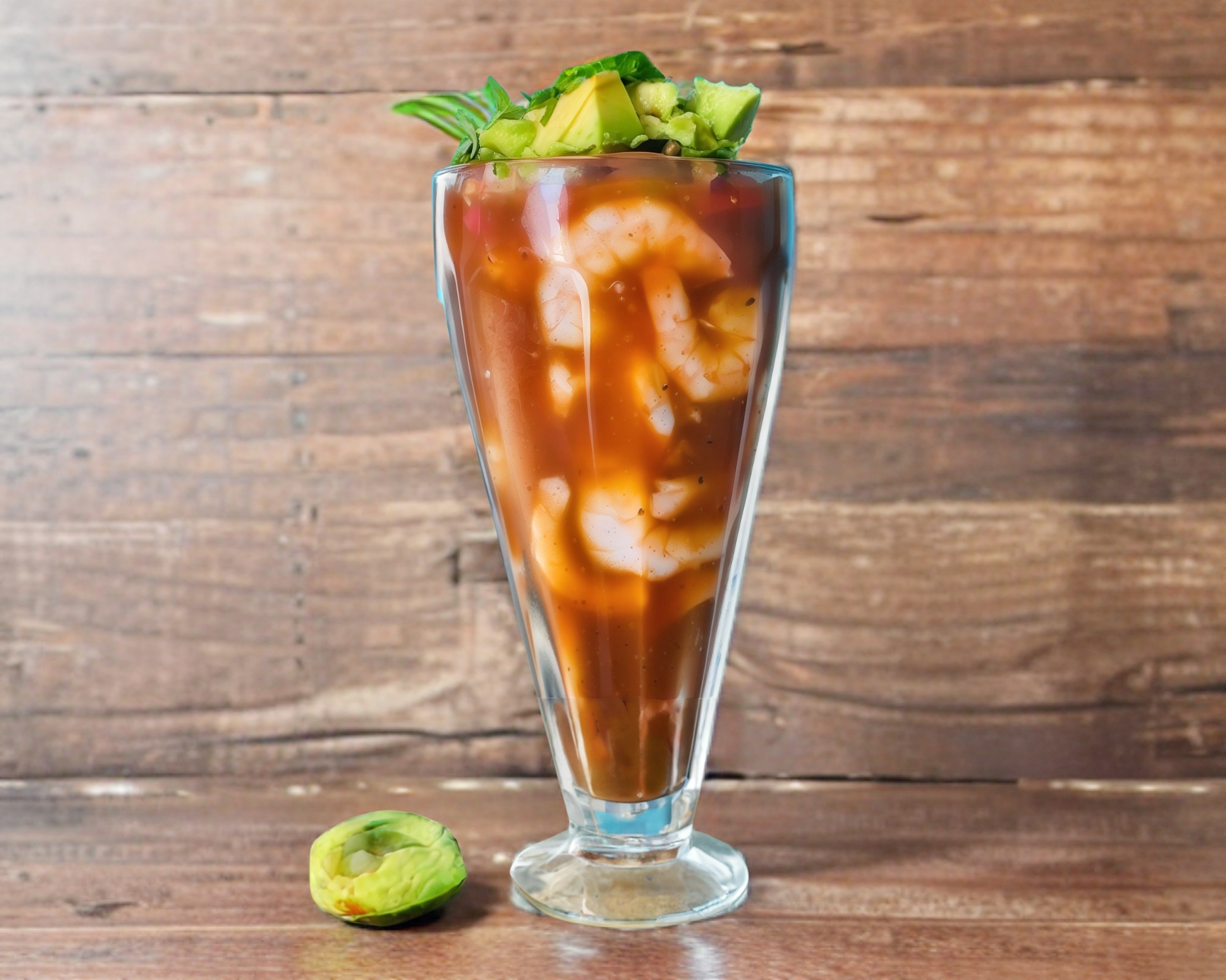 Delicioso camarón sinaloense cocido, salsa de tomate, pico de gallo y aguacate.
