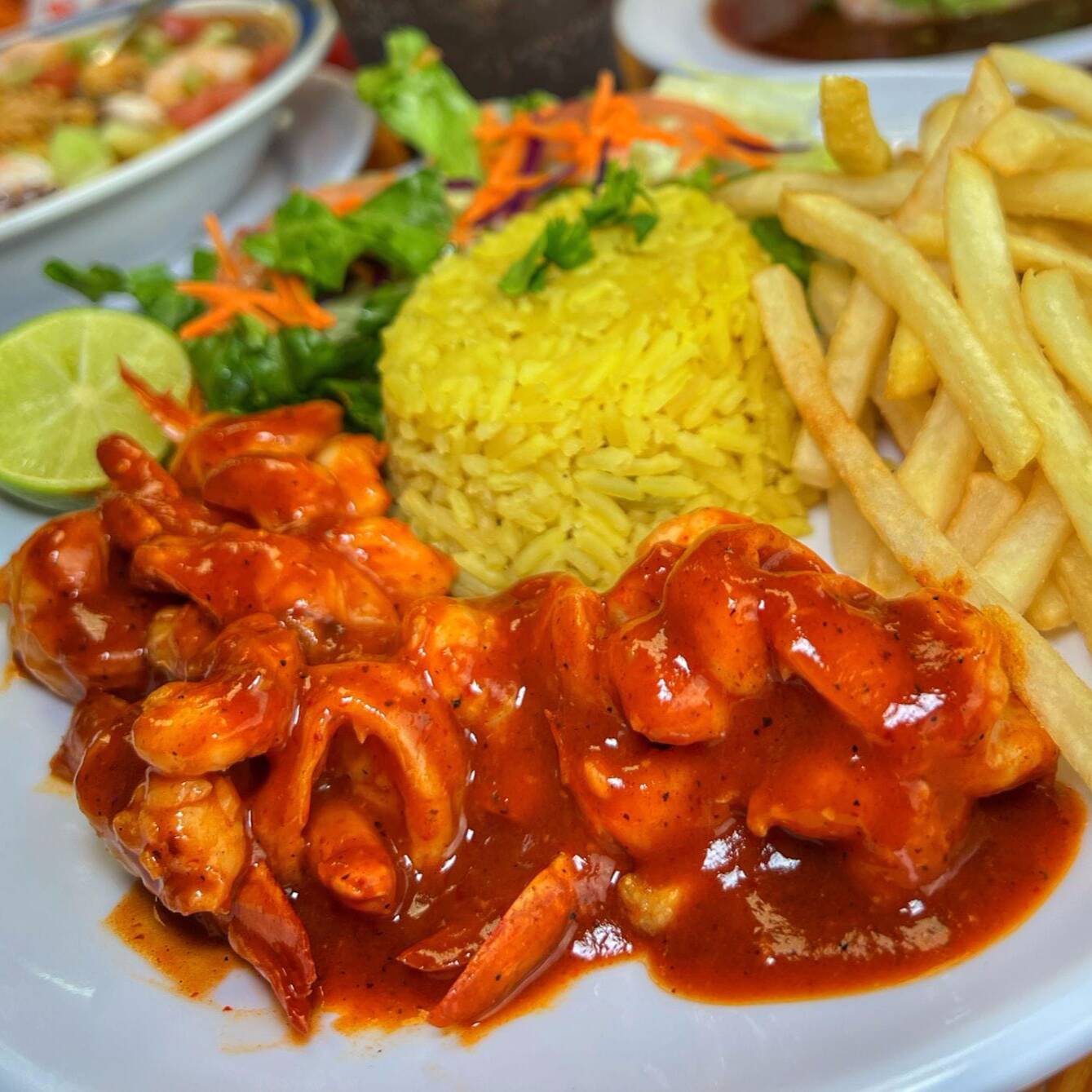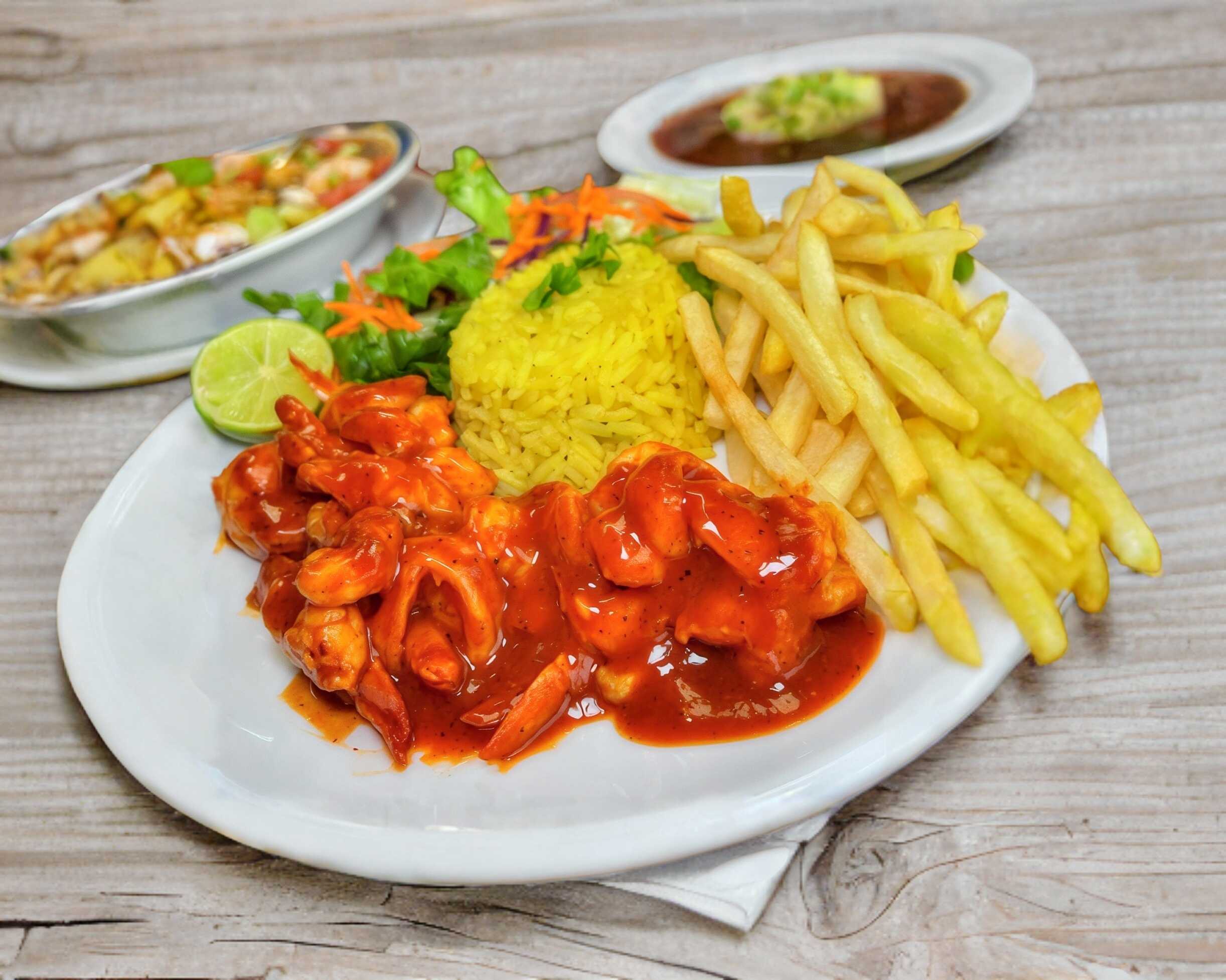 12 Camarones bañados en salsa diabla, acompañados de arroz, ensalada y papas a la francesa.
