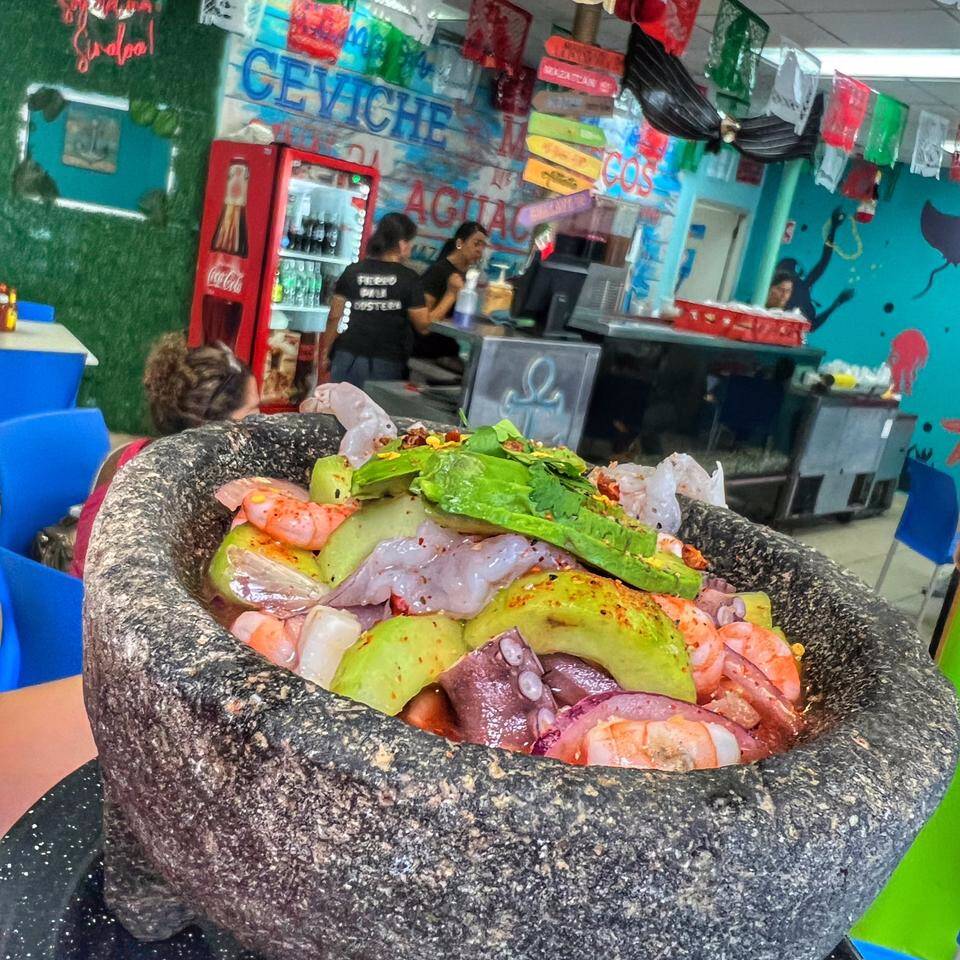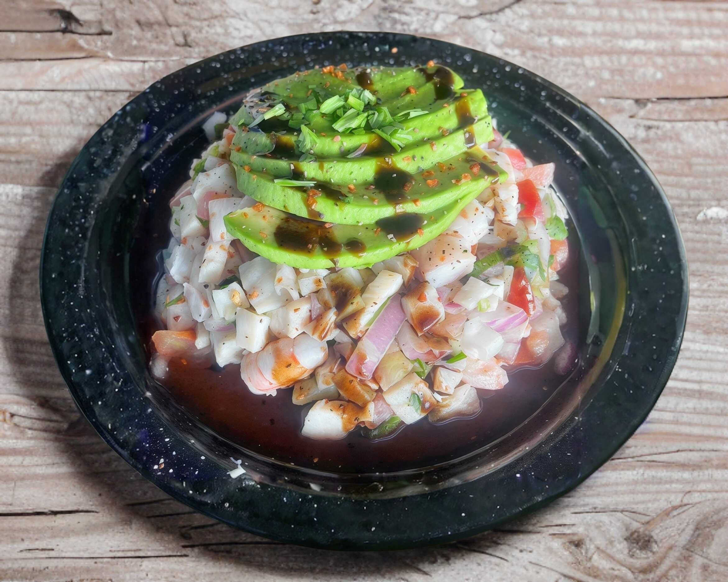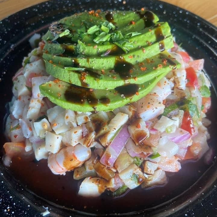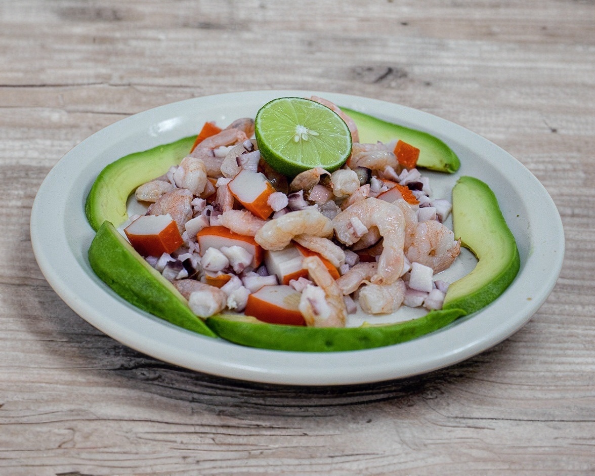 Lleva camarón cocido, tilapia curtida, Clamato, aguacate, pepino, cebolla morada, tomate y cilantro.