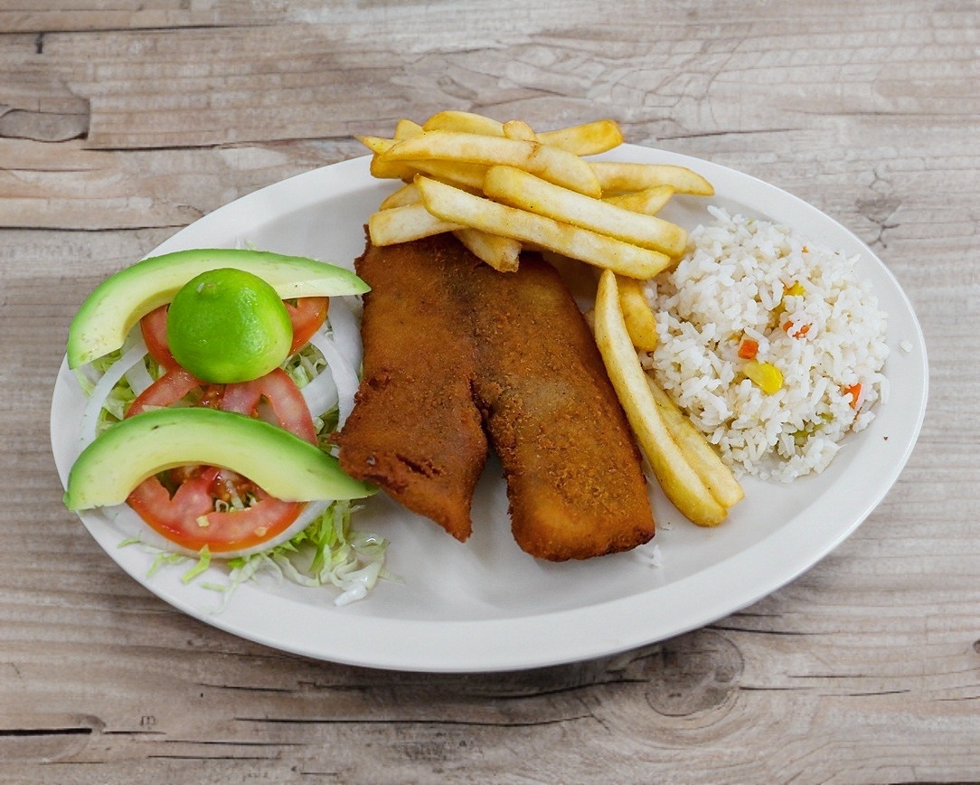 3 Filetes de pescado, 4 camarones empanizados, 1 taco gobernador, 3 aros de cebolla, papas a la francesa, arroz, ensalada verde y aderezo.