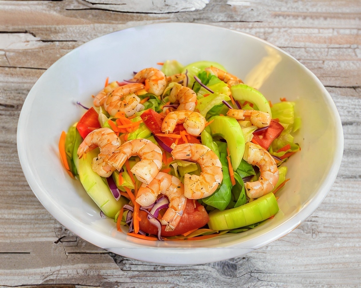 12 Camarones cocidos mezclados con lechuga, tomate, zanahoria, pepino, col morada y aderezo.