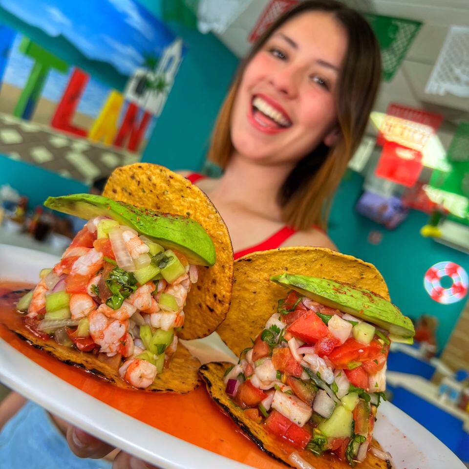 Tostada con ceviche de camarón cocido, pico de gallo y aguacate.