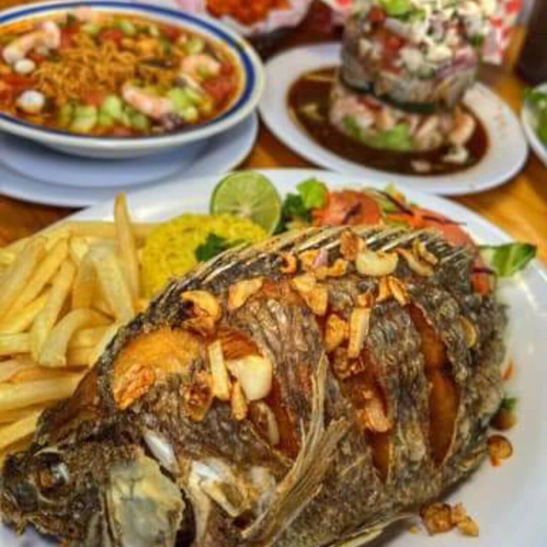Mojarra frita (500 a 650 g) con trocitos de ajo frito y mantequilla, papas a la francesa, arroz y ensalada.
