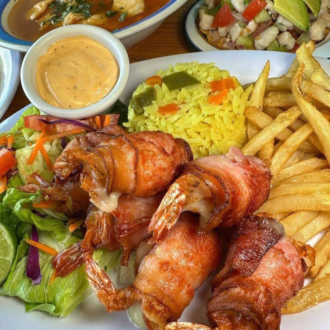 6 Camarones dobles rellenos de queso y envueltos con tocino con arroz, ensalada y papas a la francesa.