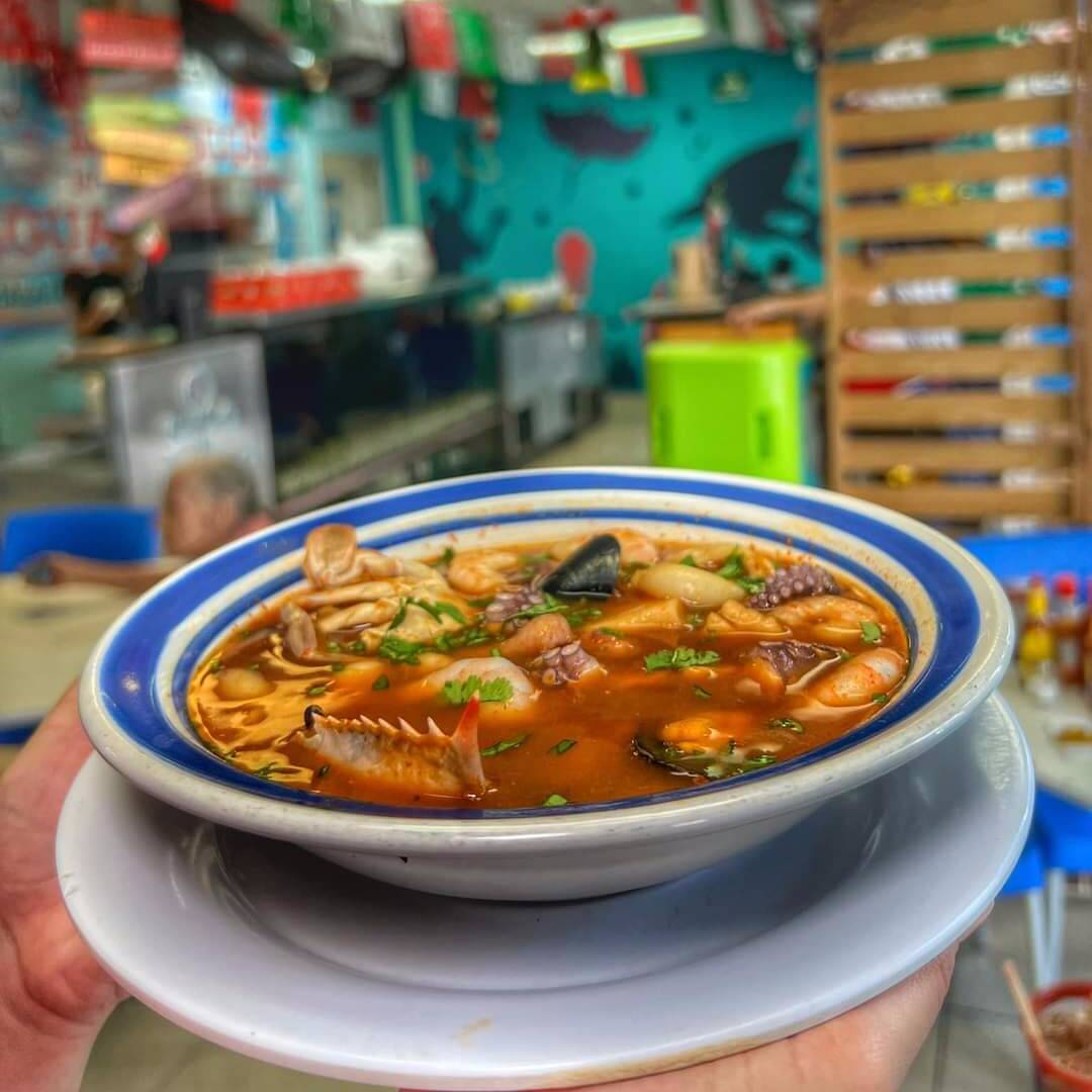 Un litro de consomé con trozos de pescado, camarón, almeja y combinado de mariscos.