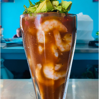 Lleva camarón cocido, limón, Clamato, aguacate, pepino, cebolla morada, tomate y cilantro.