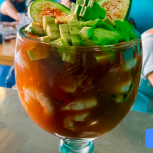 Combinación de camarón sinaloense, pulpo cocido y surimi, salsa de tomate, con pico de gallo y aguacate.