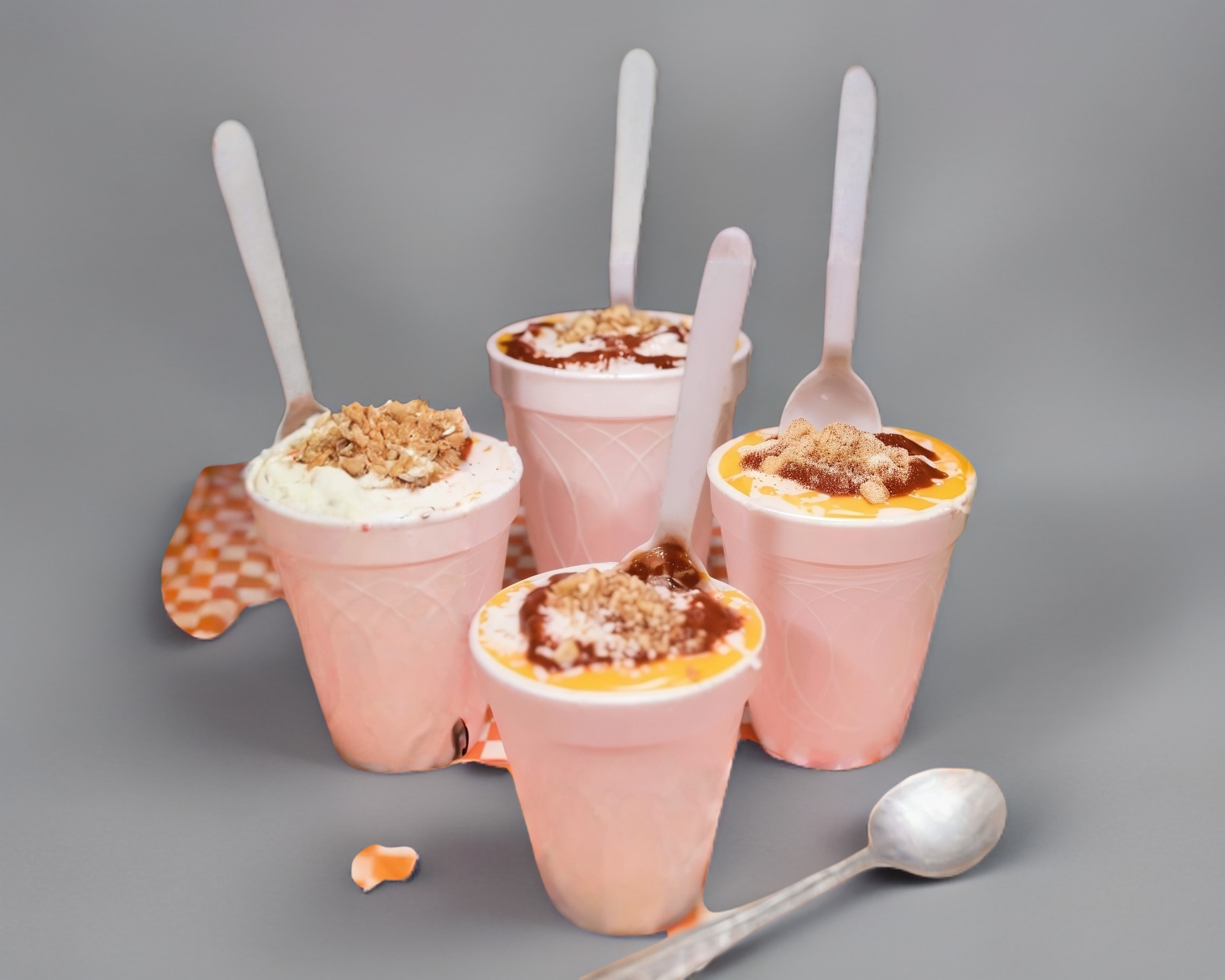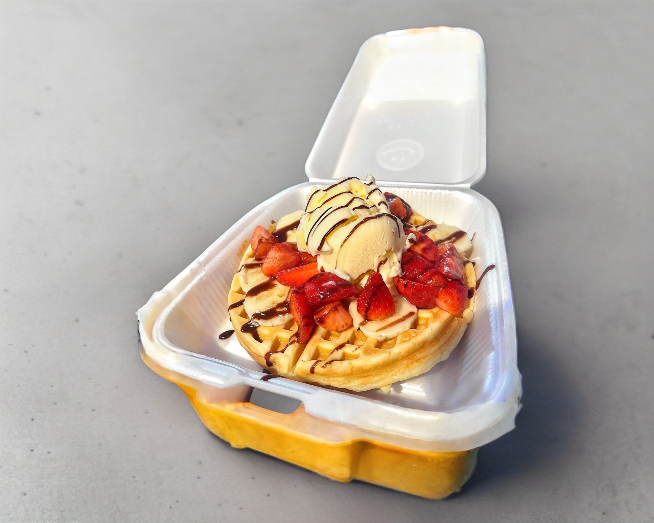 2 Waffle preparado con 3 topping acompañado de un vasito de nieve.