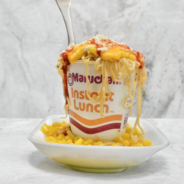 Maruchan preparada con elote amarillo, mayonesa, crema, queso amarillo, blanco y salsa.