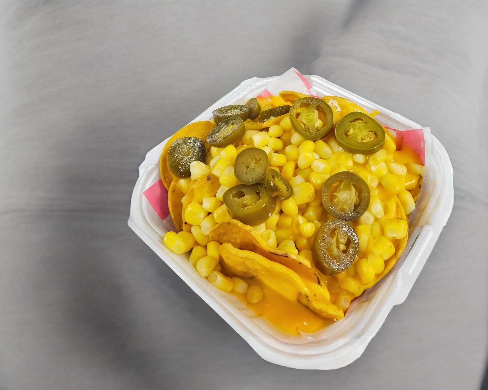 Nachos con elote amarillo, crema, queso amarillo, chiles en vinagre (nachos aparte). Platillo personal.