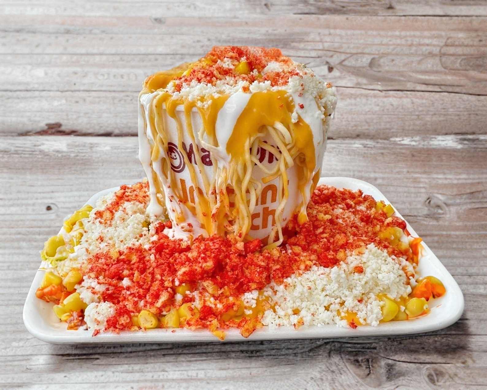 Maruchan con papitas de tu preferencia, elote amarillo, mayonesa, crema, queso amarillo, blanco y salsa.