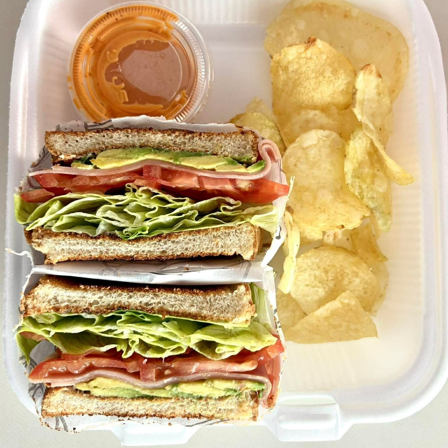 Pan tostado o suave con mayonesa, lechuga, tomate, jamón, queso americano acompañado de papas fritas y aderezo chipotle