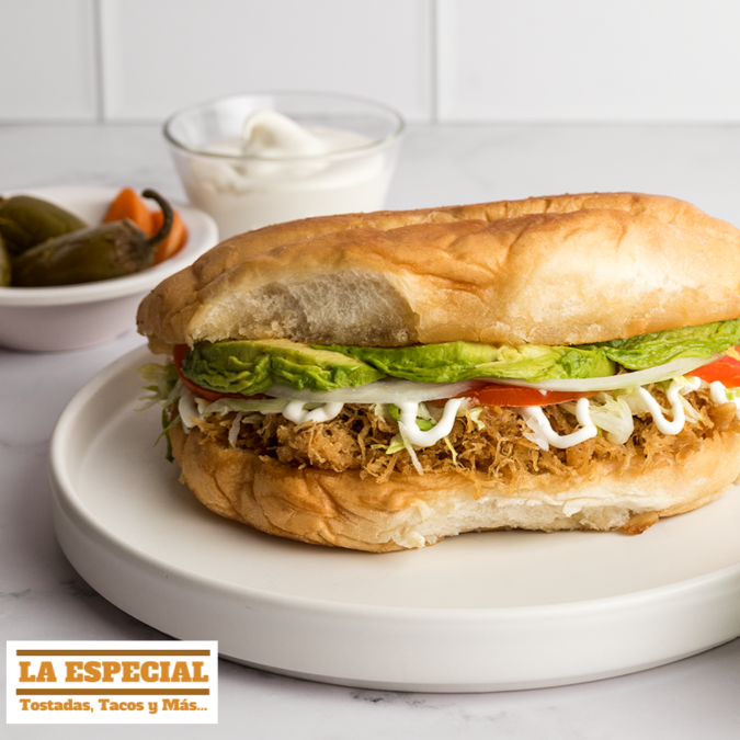 PAN ARTESANAL, CARNE DESHEBRADA CON AGUACATE, LECHUGA, TOMATE, CEBOLLA CON UNA PORCIÓN DE NUESTRA DELICIOSA CREMA.
