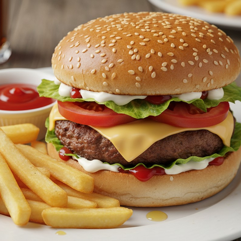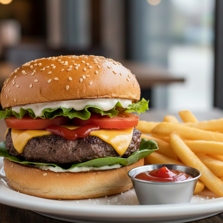 Pan de ajonjolí carne de sirloin queso amarillo, lechuga, tómate, mayonesa, cátsup,y pequeña porción de papas naturales a la francesa fritas.