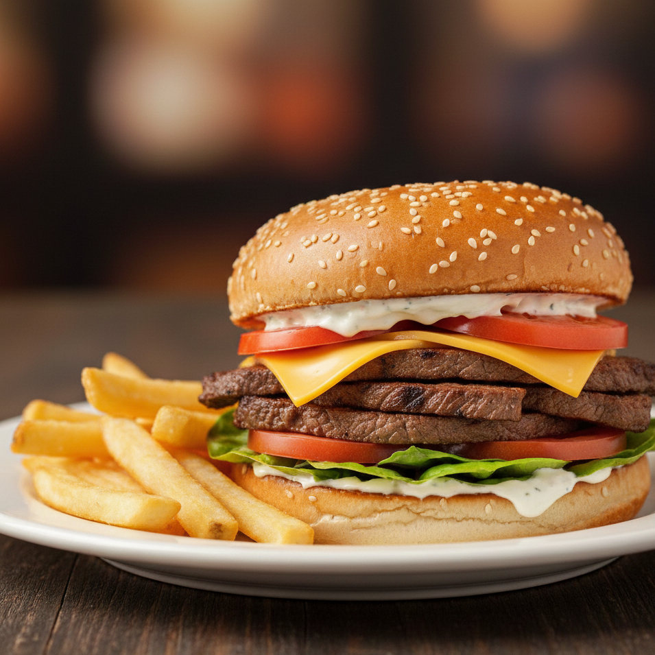 Pan de ajonjolí con 3 carnes, queso amarillo, lechuga, tómate, mayonesa, cátsup,y pequeña porción de papas naturales a la francesa fritas.