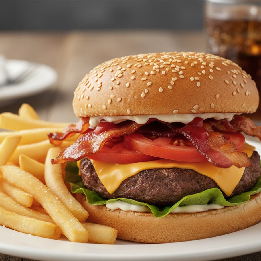 Pan de hamburguesa con ajonjolí, carne de res a la plancha, tocino crujiente, lechuga fresca, jitomate, mayonesa y catsup. Acompañada de 80 g de papas fritas doradas
