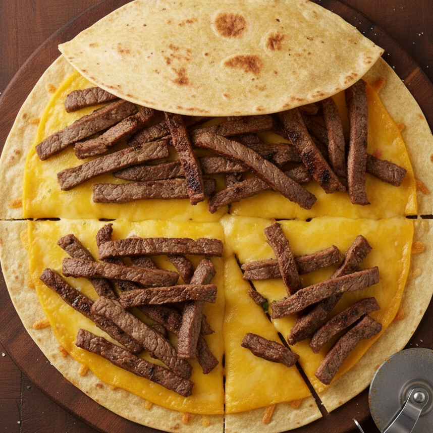 Tortilla de harina con queso y carne de bistec con otra tortilla .
