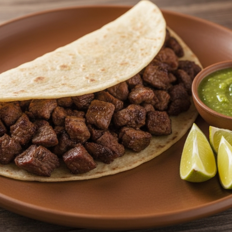 Tortillas de harina con carne de bistec Incluye ; limón y salsa.