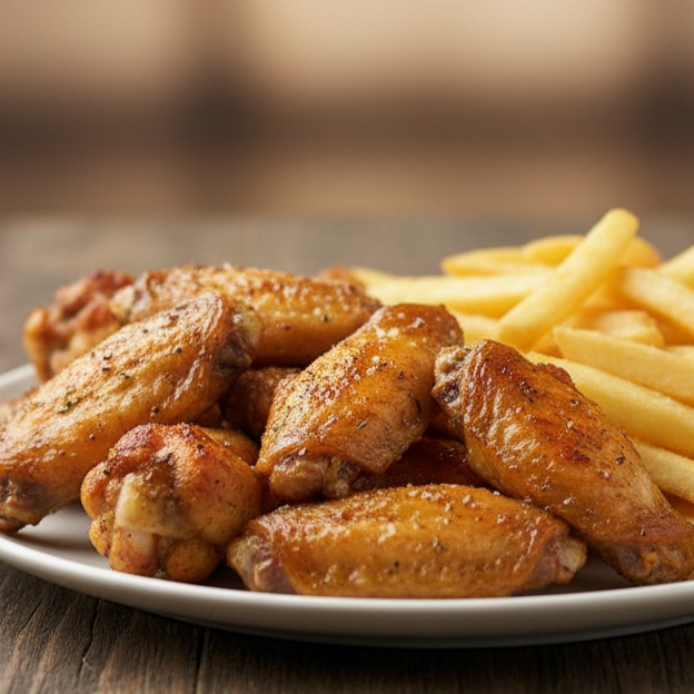 Un kilo de alitas con salsa a elegir y papas naturales fritas a la francesa.