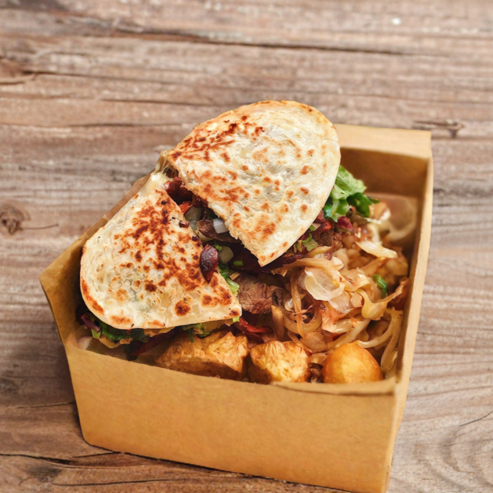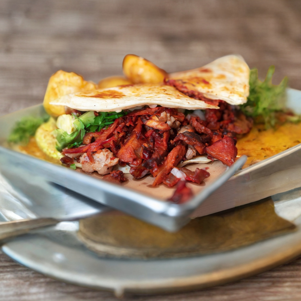 TORTILLA DE HARINA CON CARNE DE TROMPO Y BISTEC, CEBOLLA, CILANTRO, LIMON Y SALSA