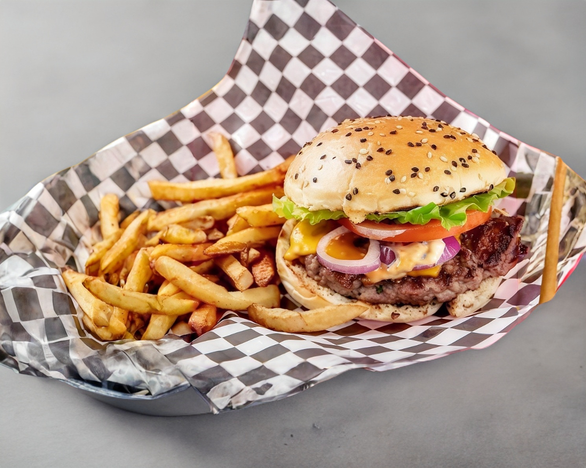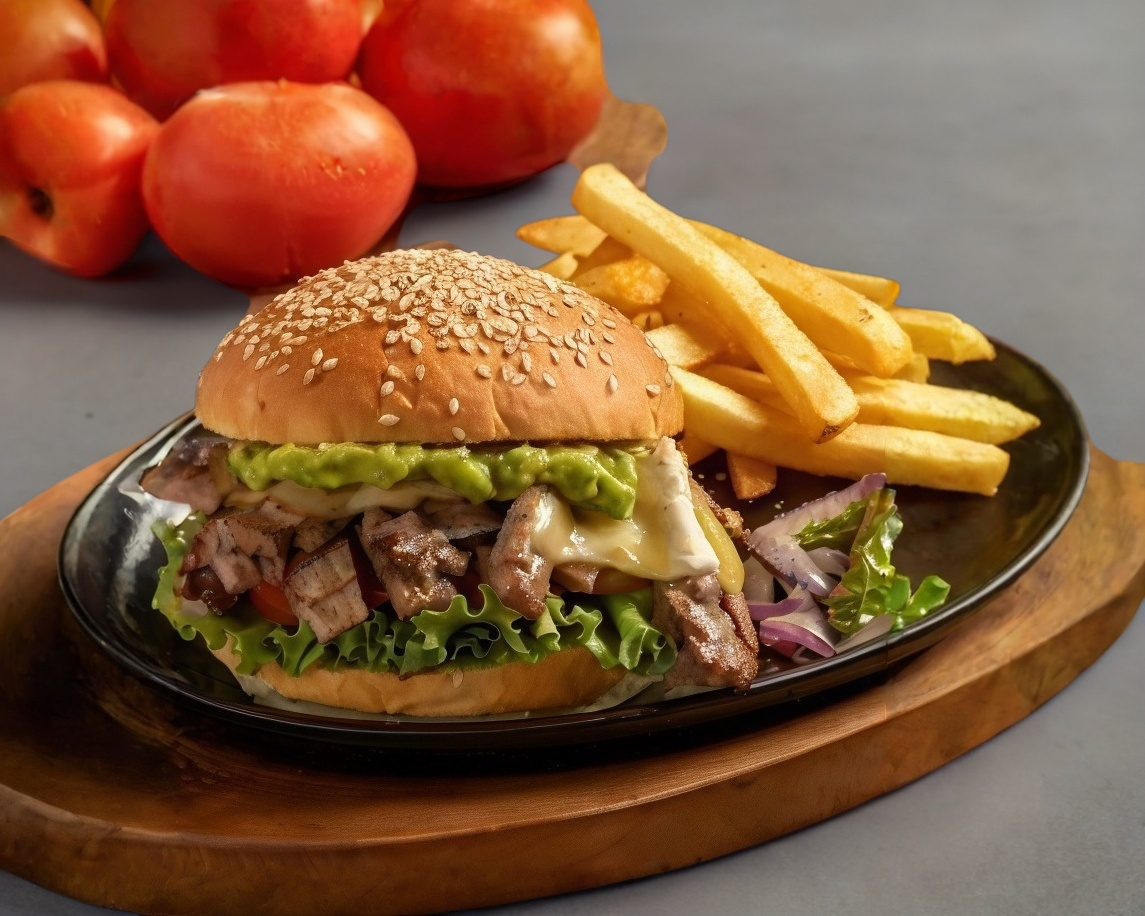 PAN DE HAMBURGUESA CON AJONJOLI, CARNE DE RES, JAMON, QUESO AMARILLO, LECHUGA, TOMATE, GUACAMOLE, MAYOESA Y PAPAS