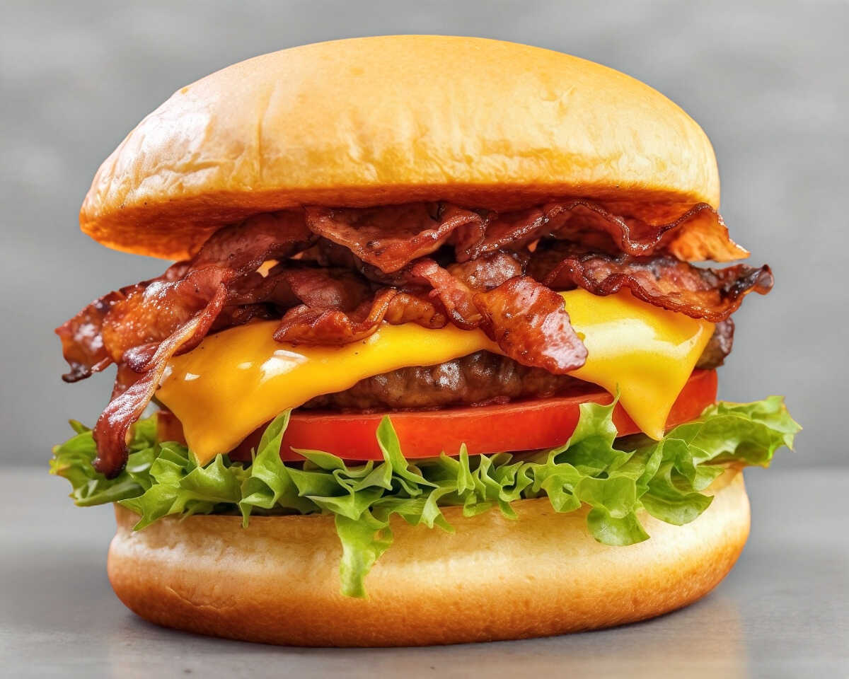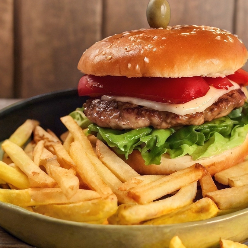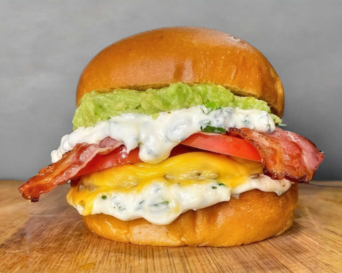 PAN DE HAMBURGUESA CON AJONJOLI, CARNE DE RES, JAMON, QUESO AMARILLO, TOCINO, LECHUGA, TOMATE, AGUACATE, MAYOESA Y PAPAS