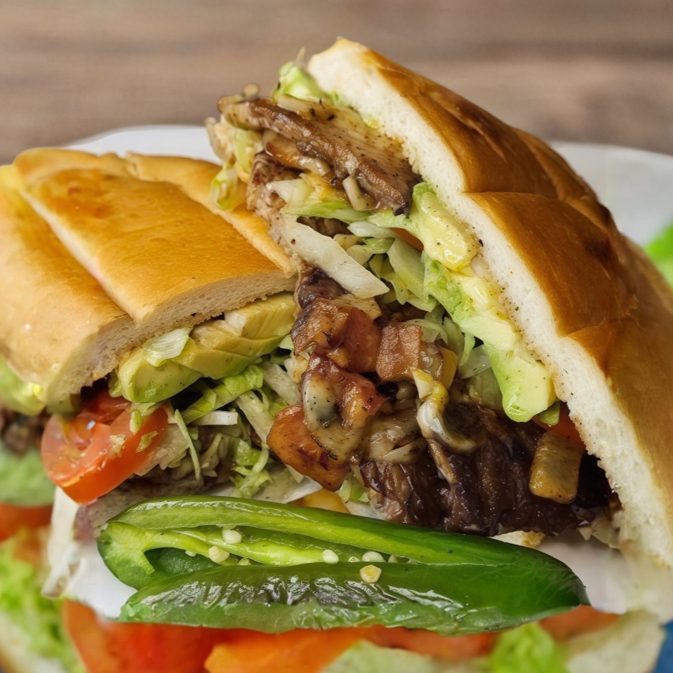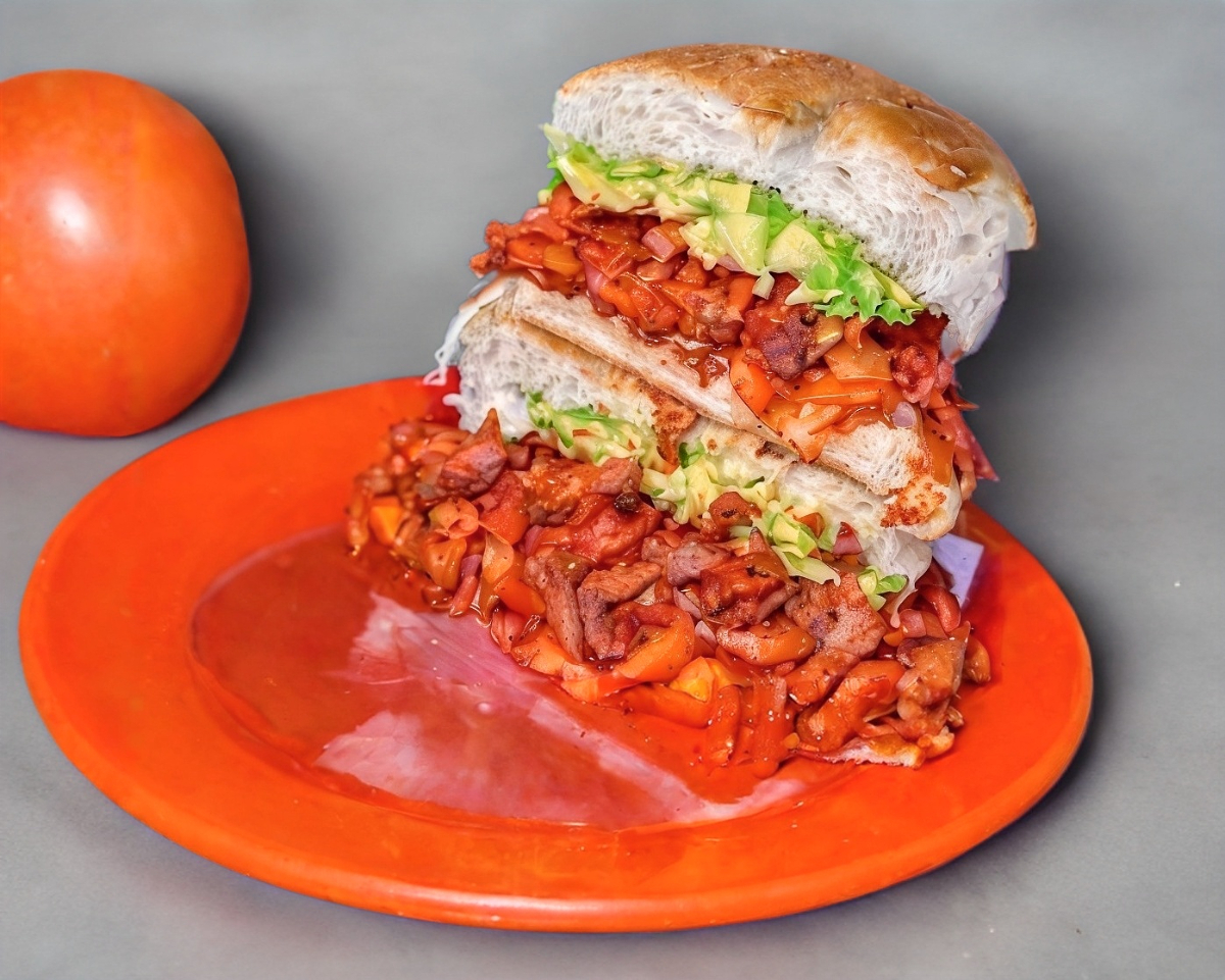PAN FRANCES, CARNE DE TROMPO Y BISTEC, AGUACATE, LECHUGA, TOMATE Y MAYONESA