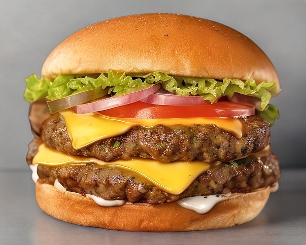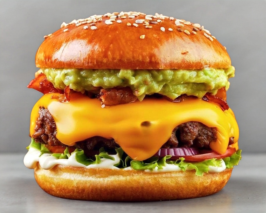 PAN DE HAMBURGUESA CON AJONJOLI, DOBLE CARNE DE RES, JAMON, QUESO AMARILLO, LECHUGA, TOMATE, AGUACATE, MAYOESA Y PAPAS