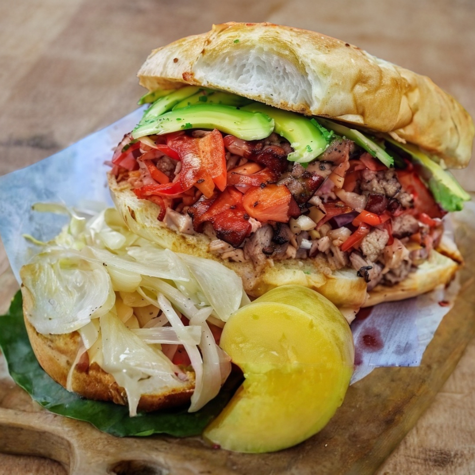 PAN FRANCES, CARNE DE TROMPO, AGUACATE, LECHUGA, TOMATE Y MAYONESA