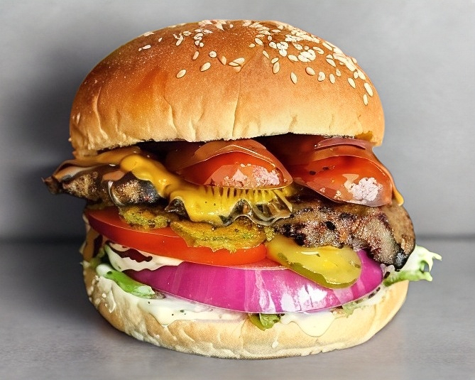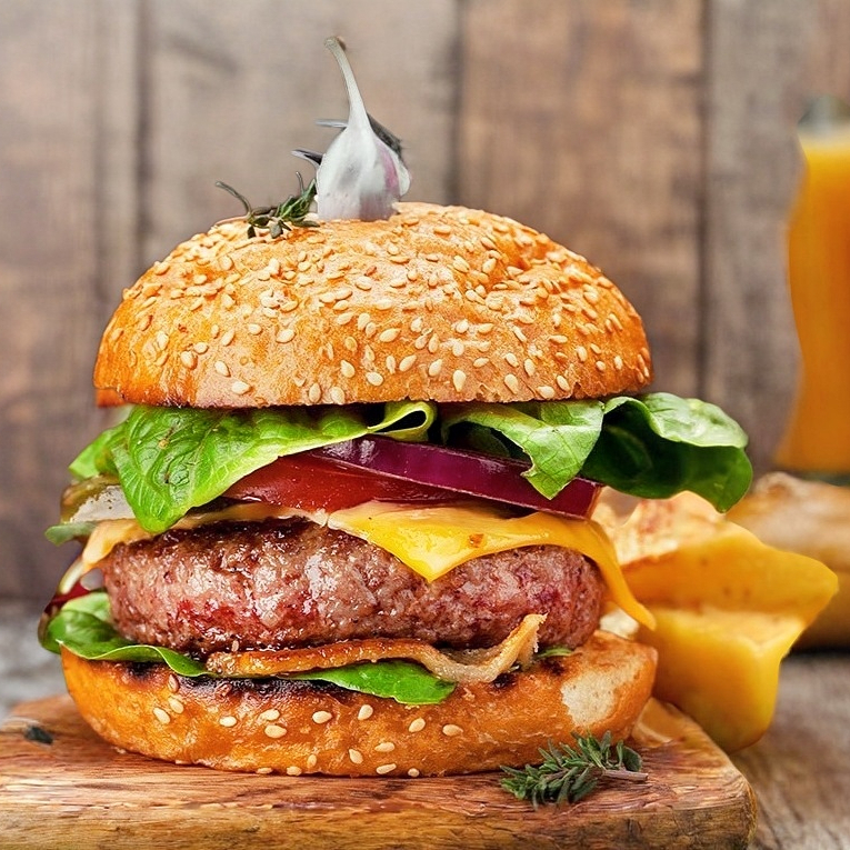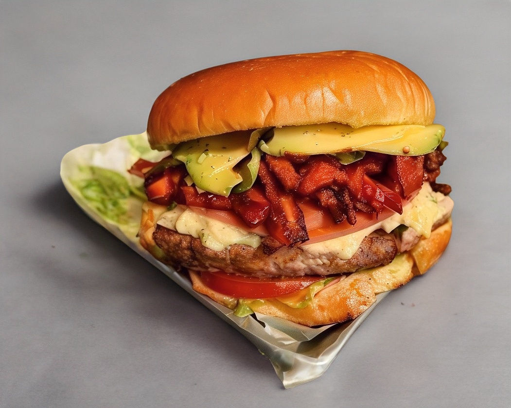 PAN DE HAMBURGUESA CON AJONJOLI, CARNE DE RES, TROMPO, JAMON, QUESO AMARILLO, LECHUGA, TOMATE, AGUACATE, MAYOESA Y PAPAS