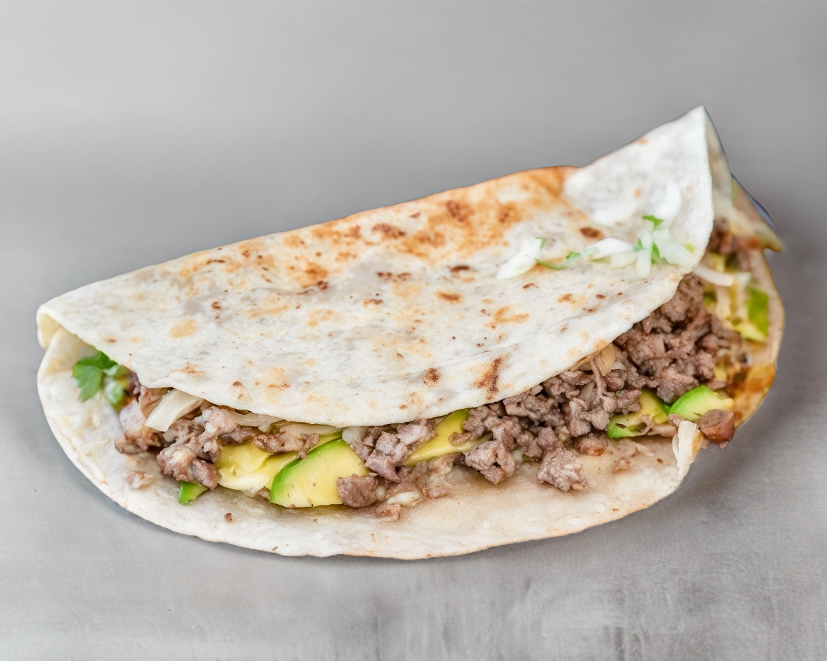 TORTILLA DE HARINA CON CARNE DE BISTEC, CEBOLLA, CILANTRO, LIMON Y SALSA