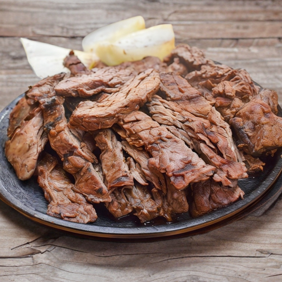 UN KILO DE CARNE DE TROMPO, CEBOLLA, CILANTRO, LIMON Y SALSA