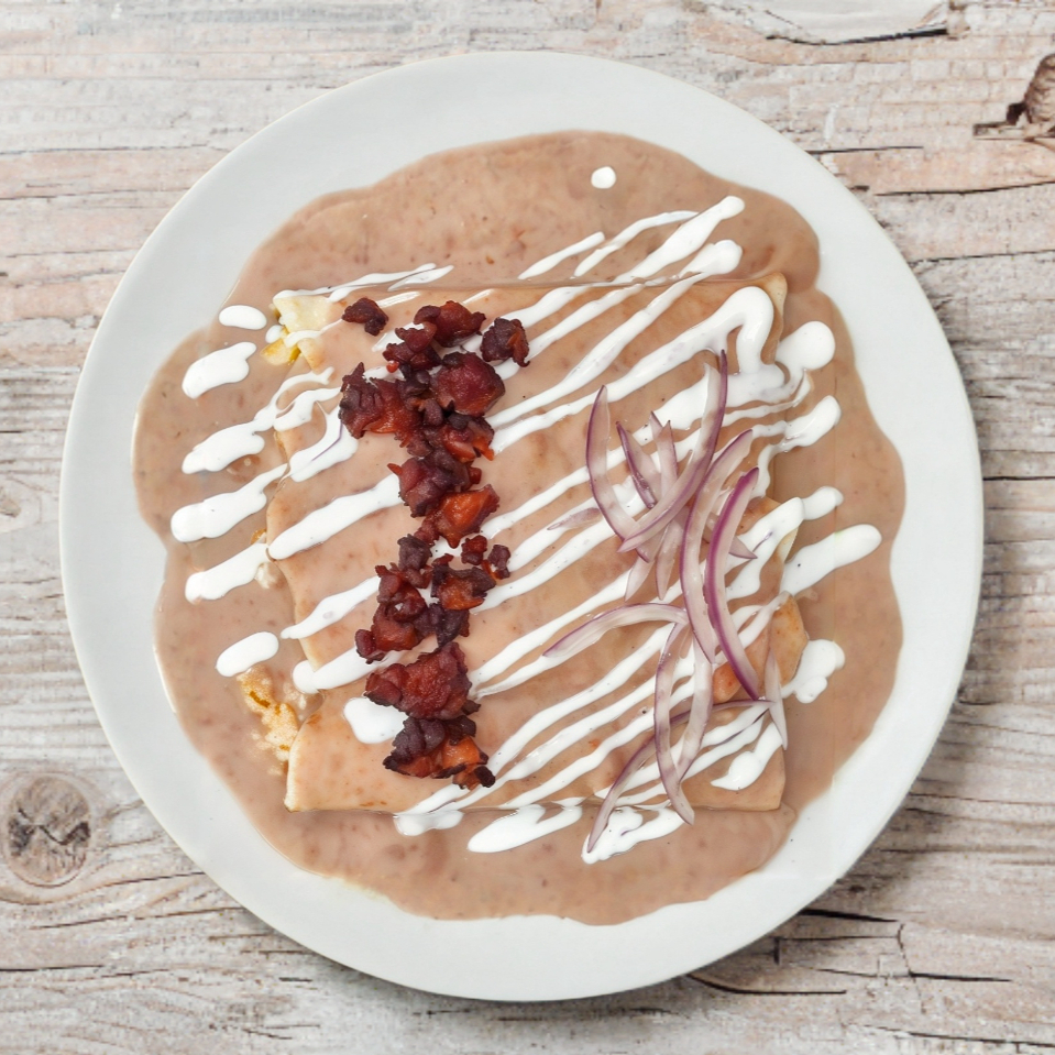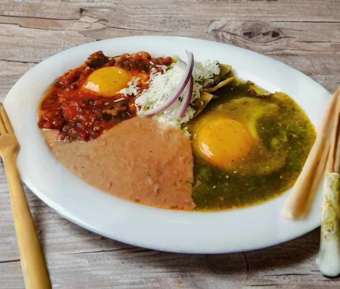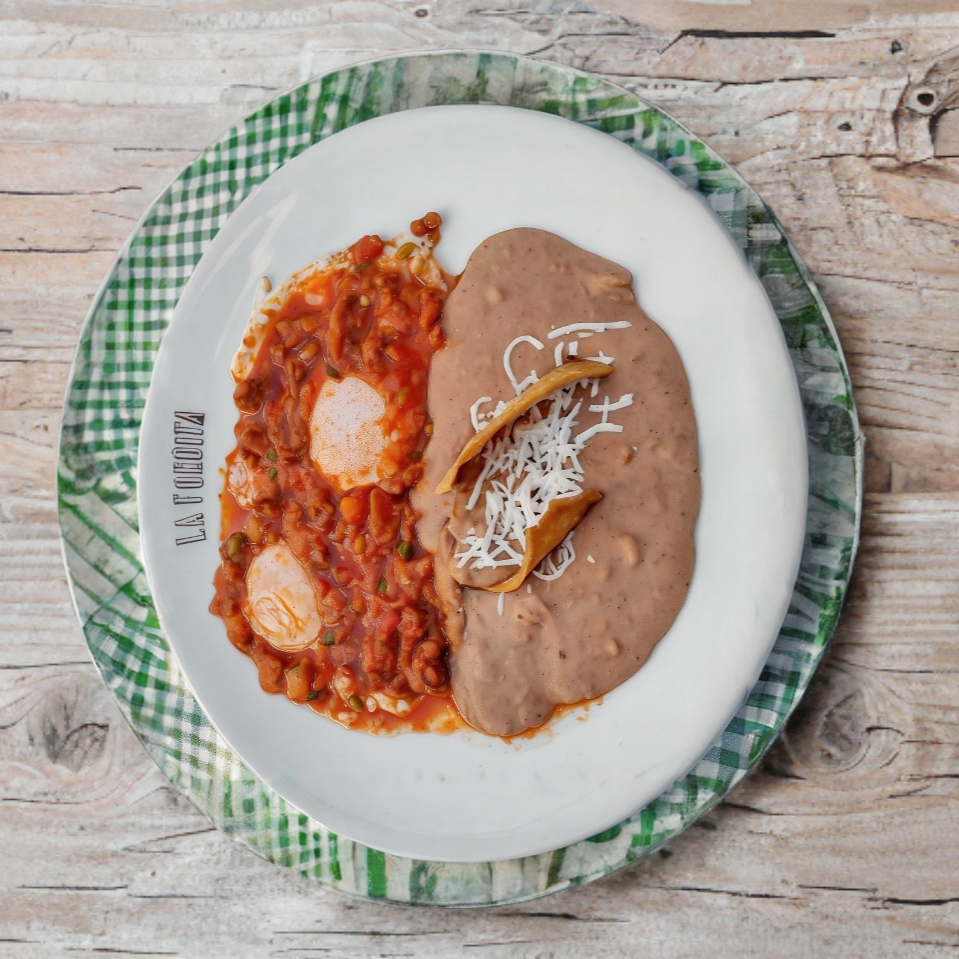 2 huevos estrellados bañados en salsa de chorizo echa en casa acompañado de frijoles refritos.