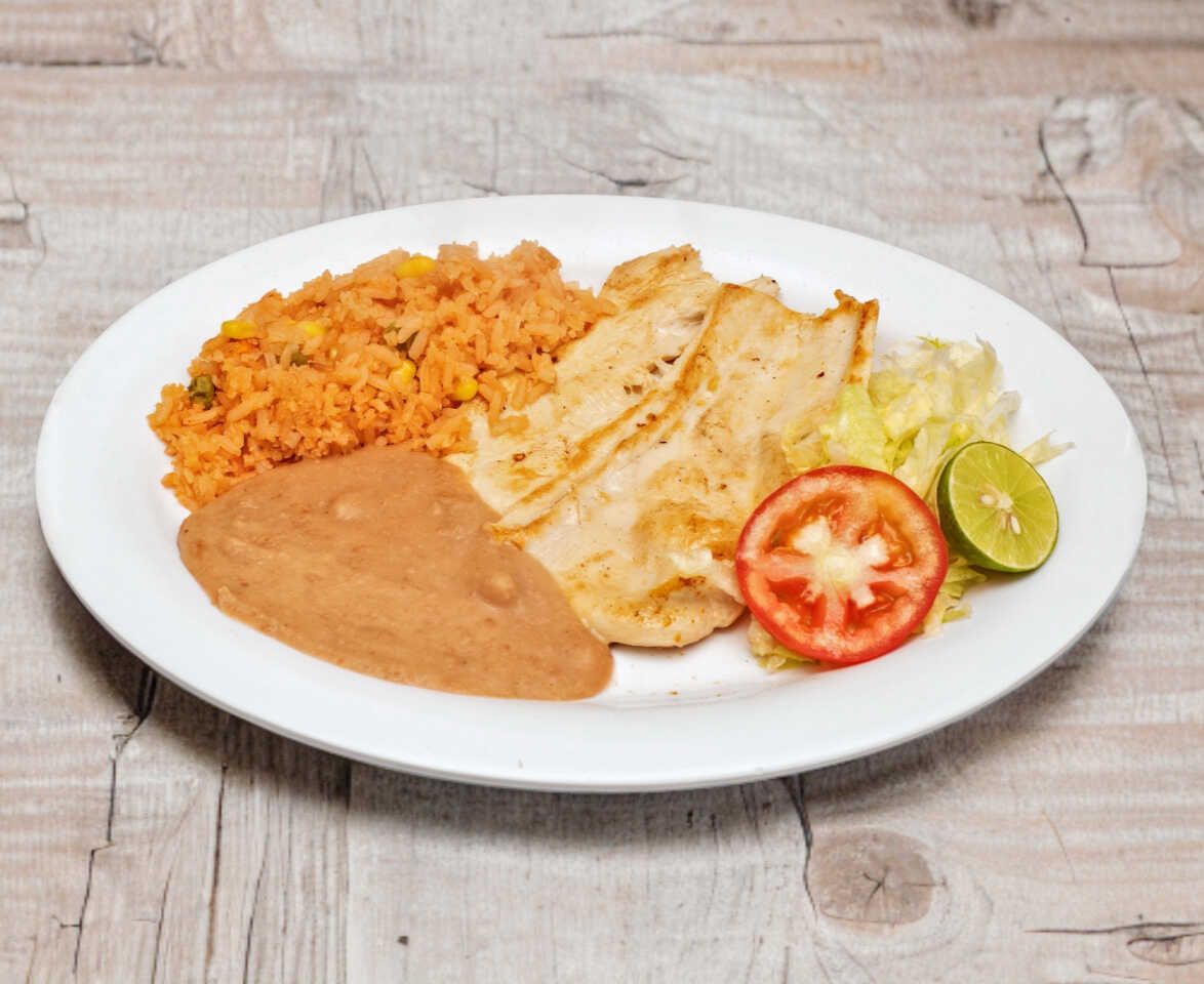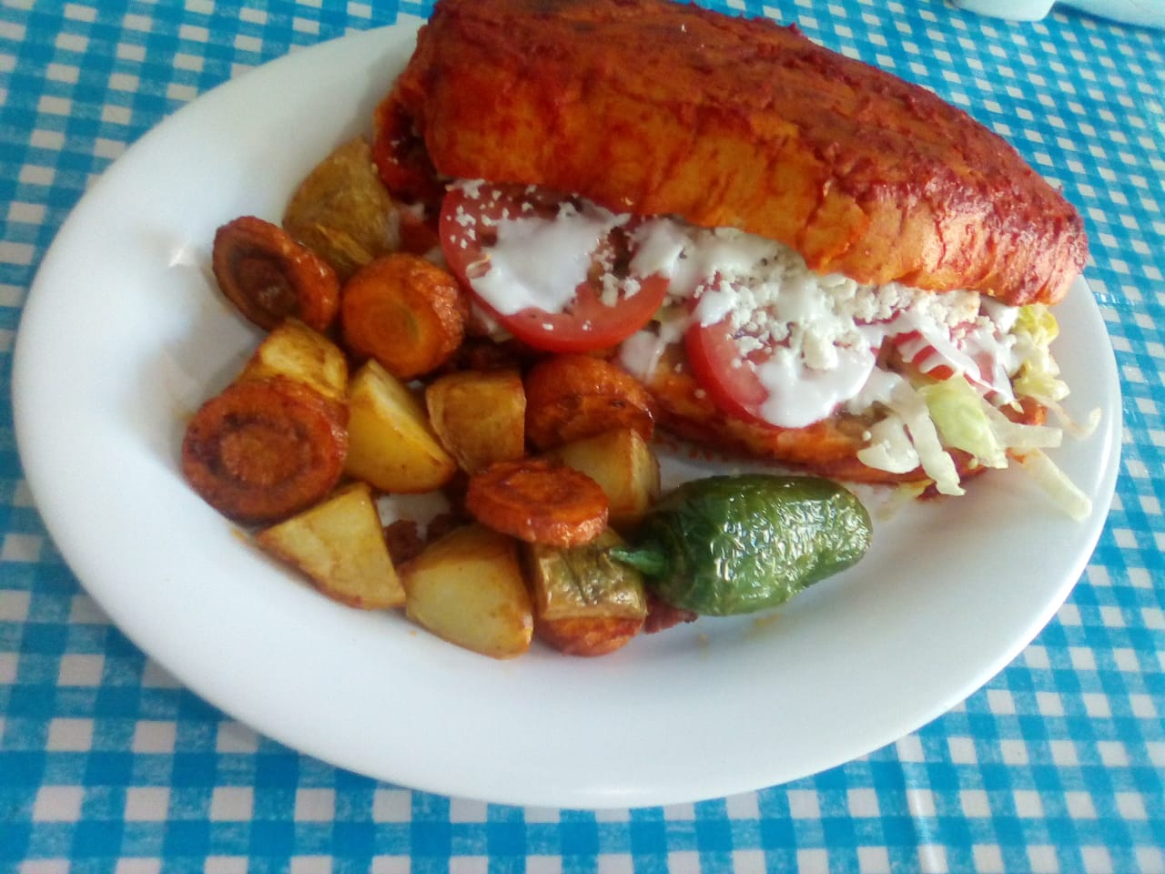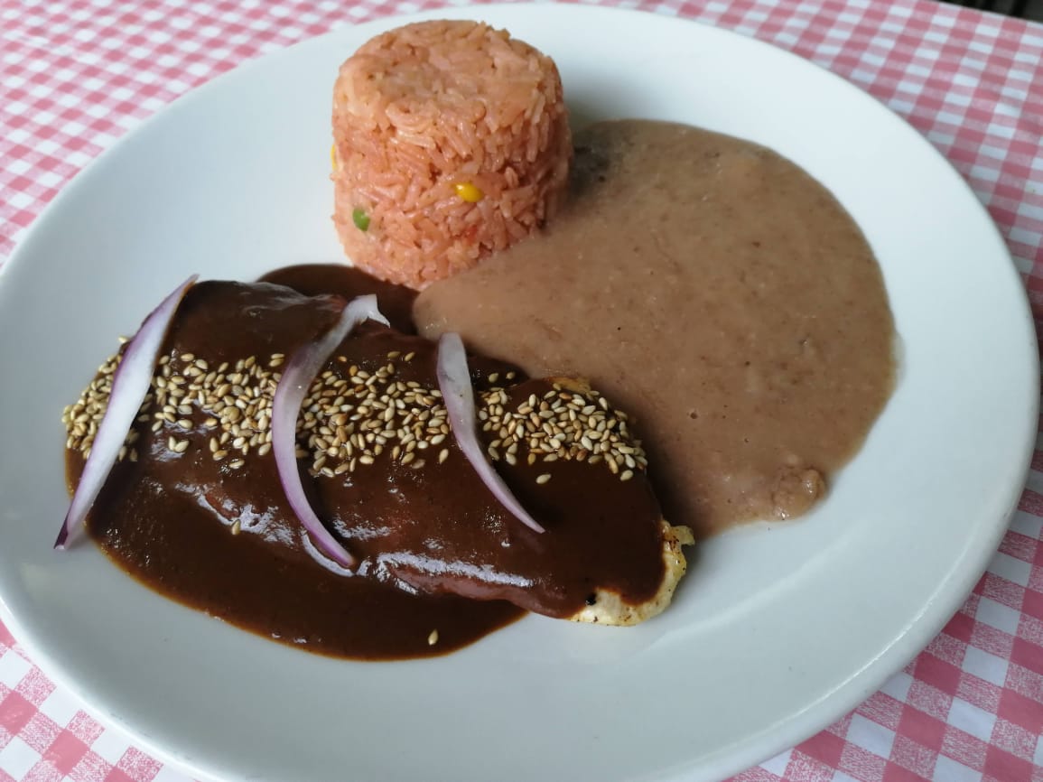 Pechuga rellena de vegetales bañanda en crema poblana acompañado de puré de papa y arroz.