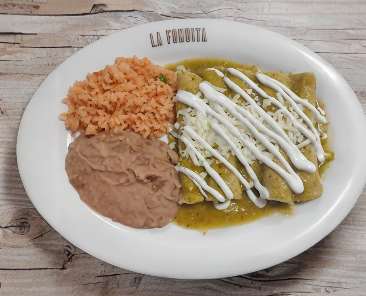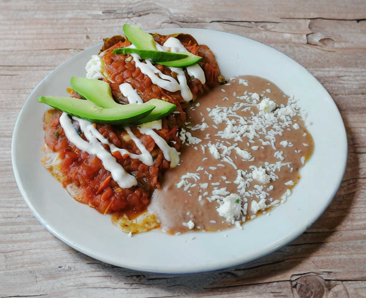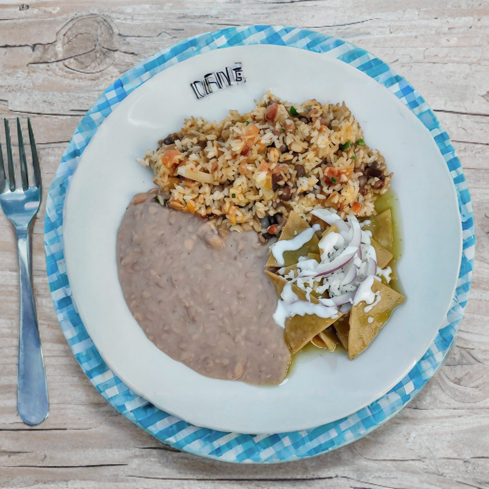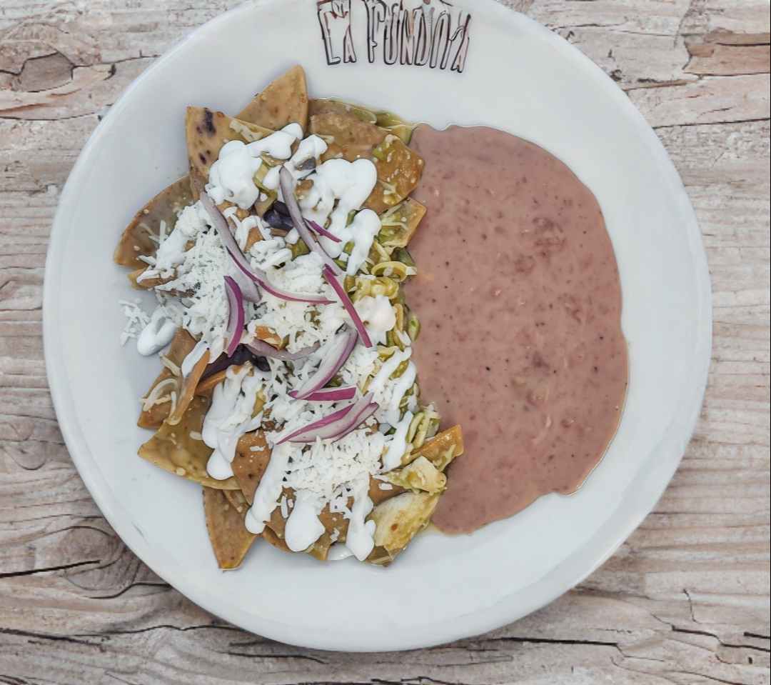 Clásicos totopos con pechuga de pollo bañados en salsa verde decorados con crema, queso panela y cebolla morada acompañado co