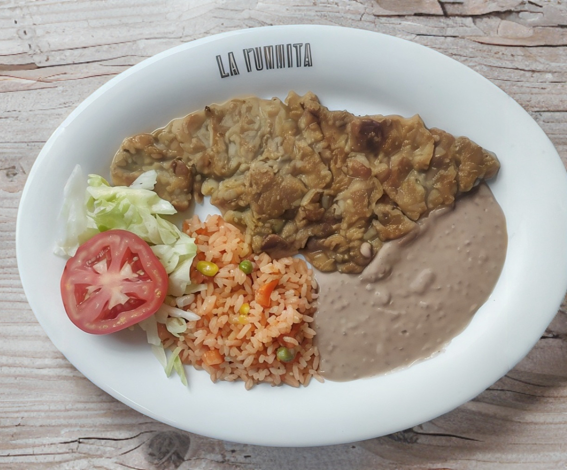 Bistec salteado con cebolla , pimiento, champiñones, un toque de ajo y chipotle en salsas negras acompañado frijoles refrito