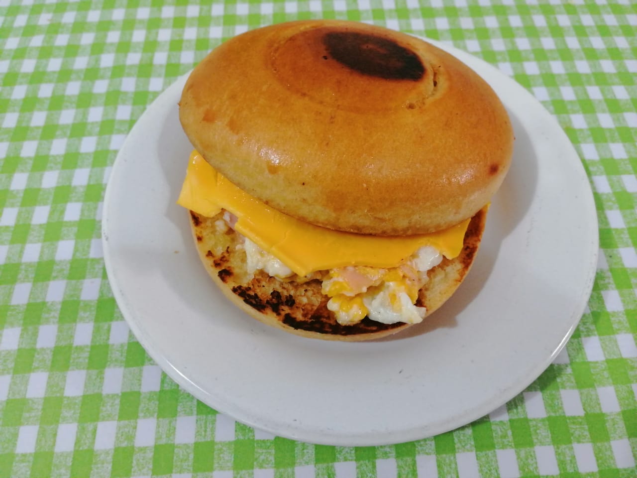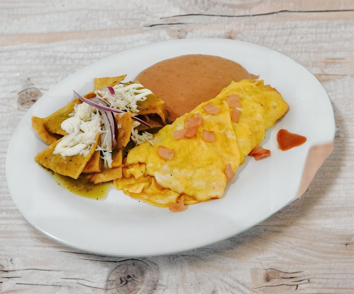 Huevos estrellados montados en tostada con jamón, bañados en salsa molcajete crema y aguacate.